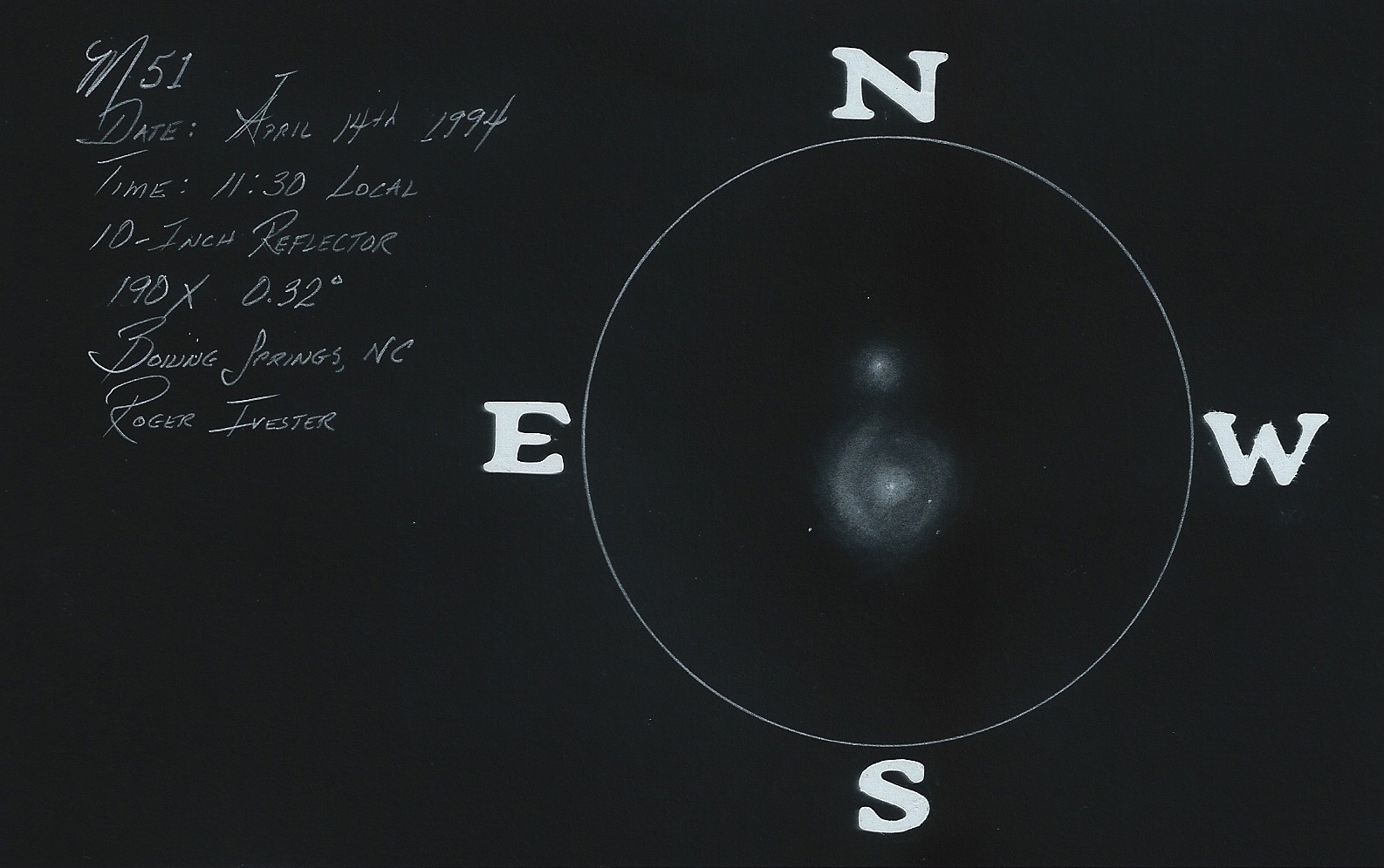 Comments: Comments Off on M51 Pencil Sketch: 10-Inch Reflector under Excellent Conditions. 5 x 8 blank notecard with the colors inverted via a scanner.