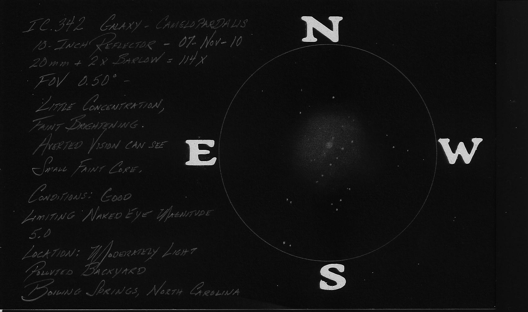 IC 342 10-Inch Reflector @ 114x 0.50° FOV; Difficult from my moderately light polluted backyard. Limiting magnitude was 5.0