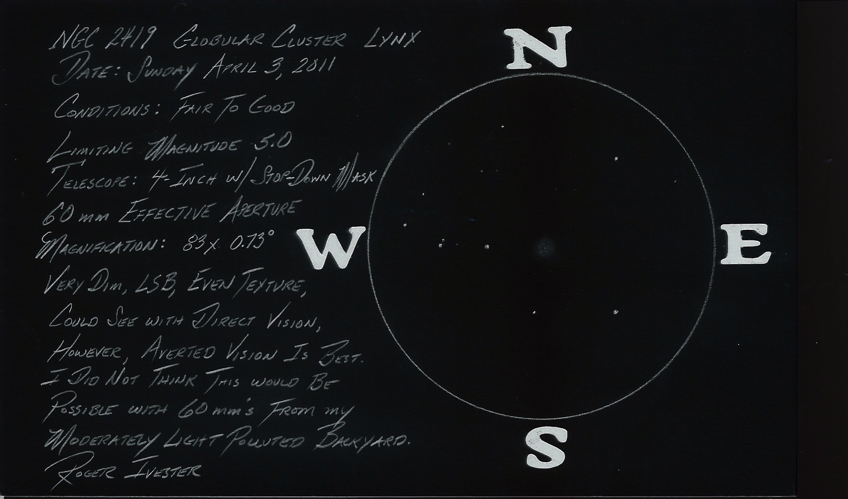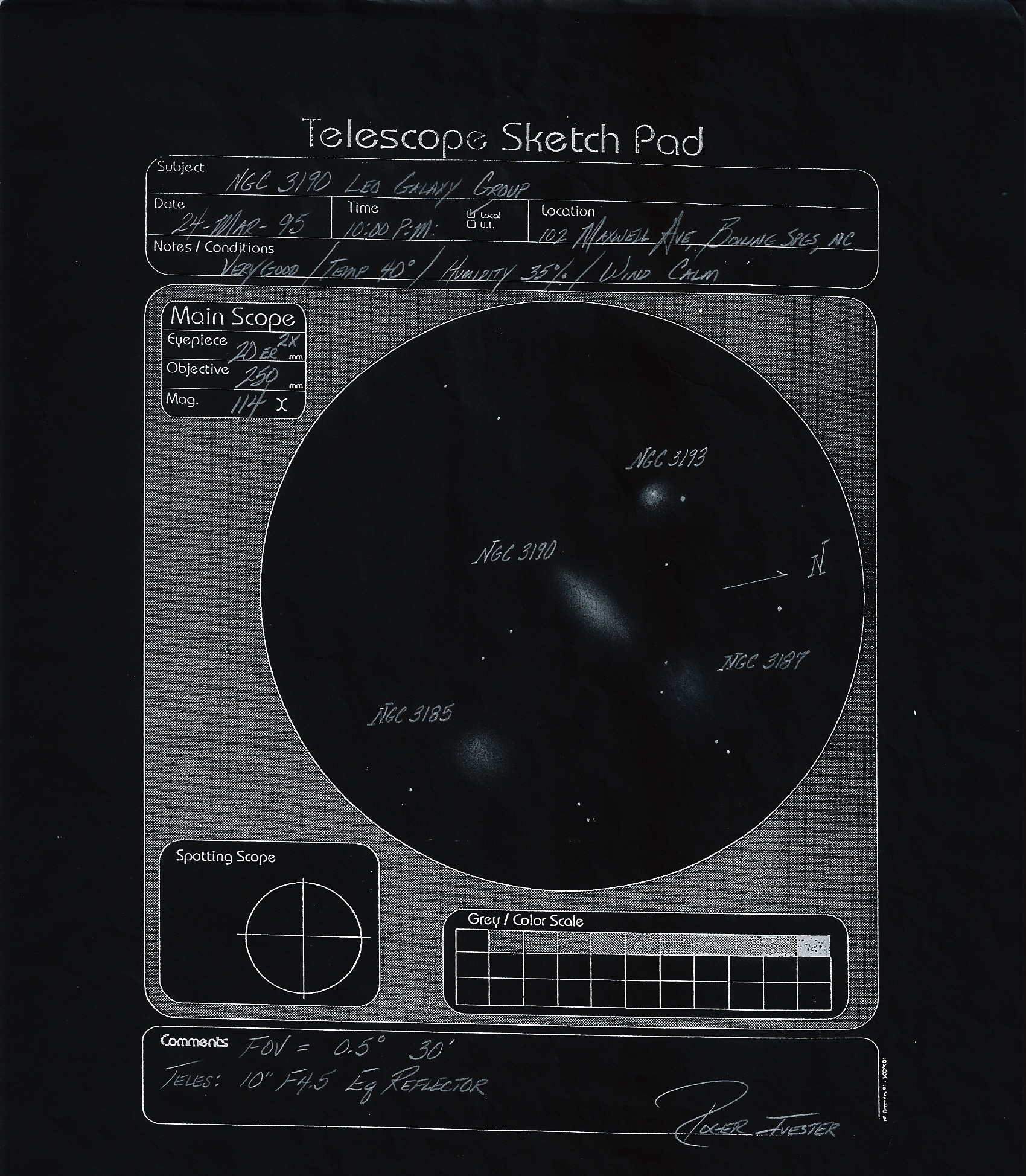 NGC 3187 at 13.1 magnitude is the faintest and most difficult of the group. When observed with the 10-inch, averted vision is required. It appears as little more than a faint glow, requiring an excellent night just to glimpse. I have never been able to hold this faint galaxy constantly, even with averted vision. On many nights, I am unable to see this galaxy.