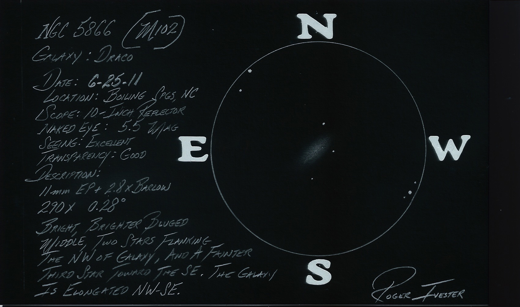 NGC 5866 is very easy to locate with my 10-inch reflector. The galaxy appears bright, elongated NW-SE, with a brighter more concentrated middle. Two faint stars could be seen flanking the NW end of the galaxy. When increasing the magnification to 200x and then 290x, a third and fainter star to the south of the galaxy could be seen fairly easy.