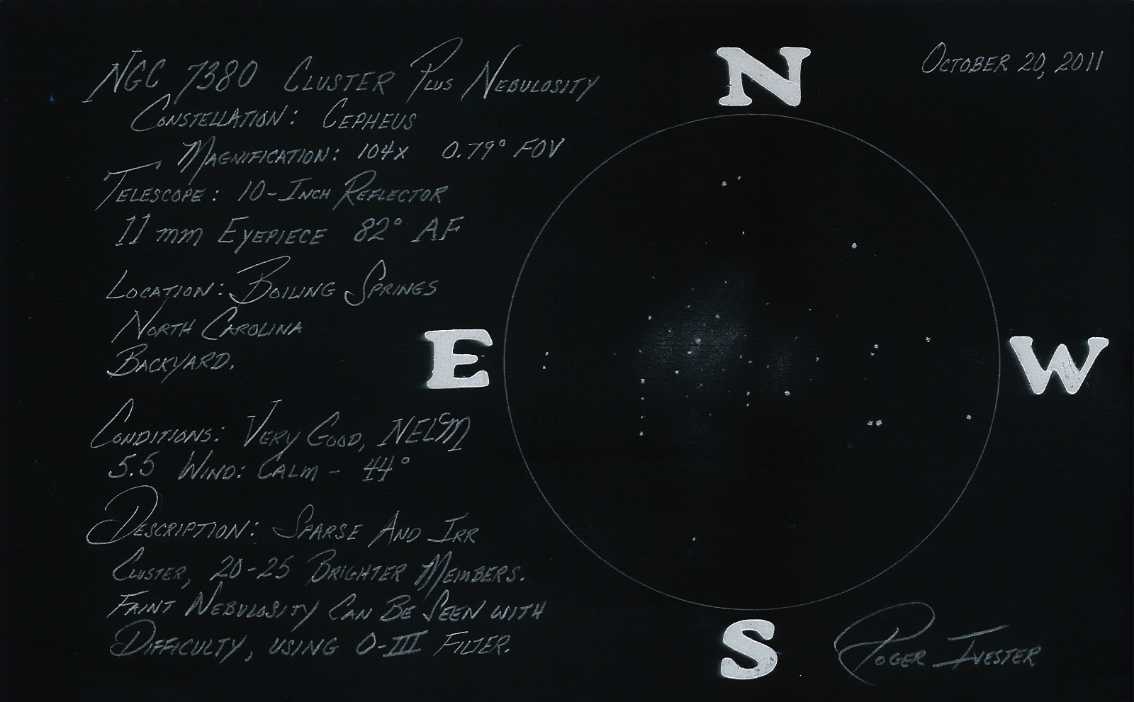 Locating and seeing this cluster with a 10-inch was very easy, however, the associated nebula proved to be very difficult.  The 10-inch reflector presented this cluster as sparse, mostly irregular in shape, with about 25 brighter members being counted.  The nebula could only be seen when using an O-III filter, with great difficulty, patience and averted vision, from a moderately light polluted site.  The NELM during this observing session was 5.5 with good seeing.  The brightest and most concentrated portion is in the central region, surrounding a chain of four stars, oriented in an approximate NNW-SW alignment.  Other areas of nebulosity, could be seen, but not constantly, one very faint section was noted to the west, and another toward the south.  Just to the east lies a row of four very faint stars in a north-south orientation.  A beautiful and fairly bright double star lies to the west of the cluster.  The sketch was made at a magnification of 104x, using drawing and graphite pencils, on a 5 x 8 notecard.
