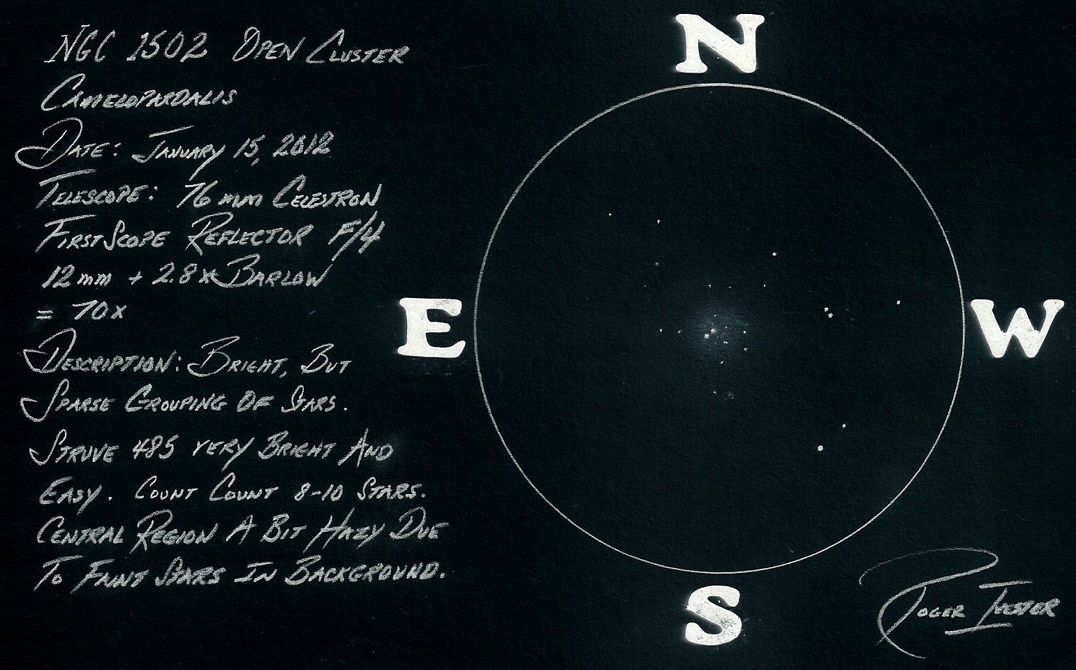 On Sunday morning before church, she filled out three note cards with her thoughts and descriptions from the previous night. She mentioned the Espin star in M41, her perception of open cluster M45, the moon, Jupiter, M42 and the Trapezium. Gracie said she understood the purpose and importance of using a red light when observing. She had leaned about this in a book she had read. I was very impressed!