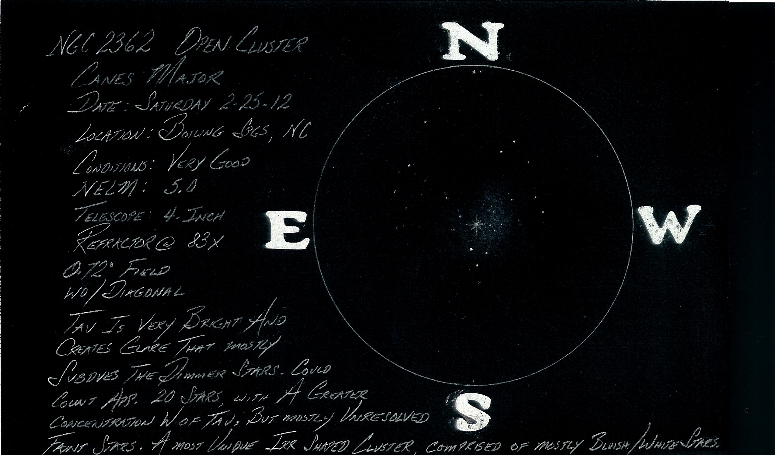 Open cluster, NGC 2362 is a beautiful and interesting cluster, which can be easily observed with the smallest of telescopes, even with a moderately light polluted sky.   However, like all deep-sky objects, a reasonably dark sky is needed to fully appreciate.