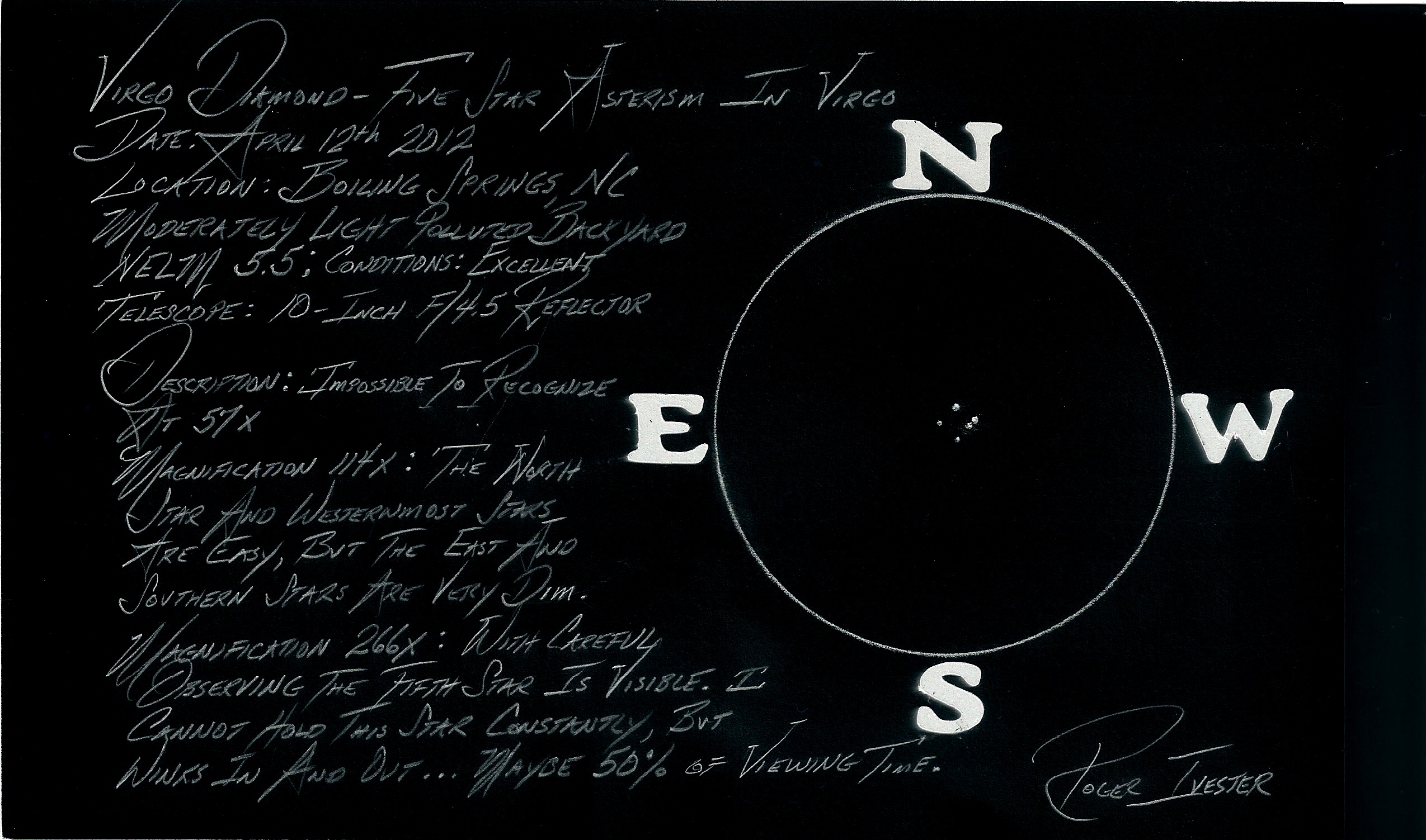My first observation of the Virgo Diamond came on the night of April 14th 1993.  I was using a 10-inch f/4.5 reflector at 190x which presented a faint grouping of four stars.  I was unable to see the fifth star.  The stars range in brightness from 10.9 to 13.7 in magnitude.  Please don’t underestimate this very faint asterism.  If conditions are not good, even the four primary stars can be difficult.