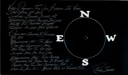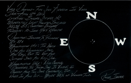 On the night of April 12th, 2012, the humidity was near 25% and seeing was exceptional.  I knew this could possibly be my last opportunity to observe the  diamond this year under conditions such as this. This proved to be a good decision, as I was finally able to see the elusive “fifth” star.