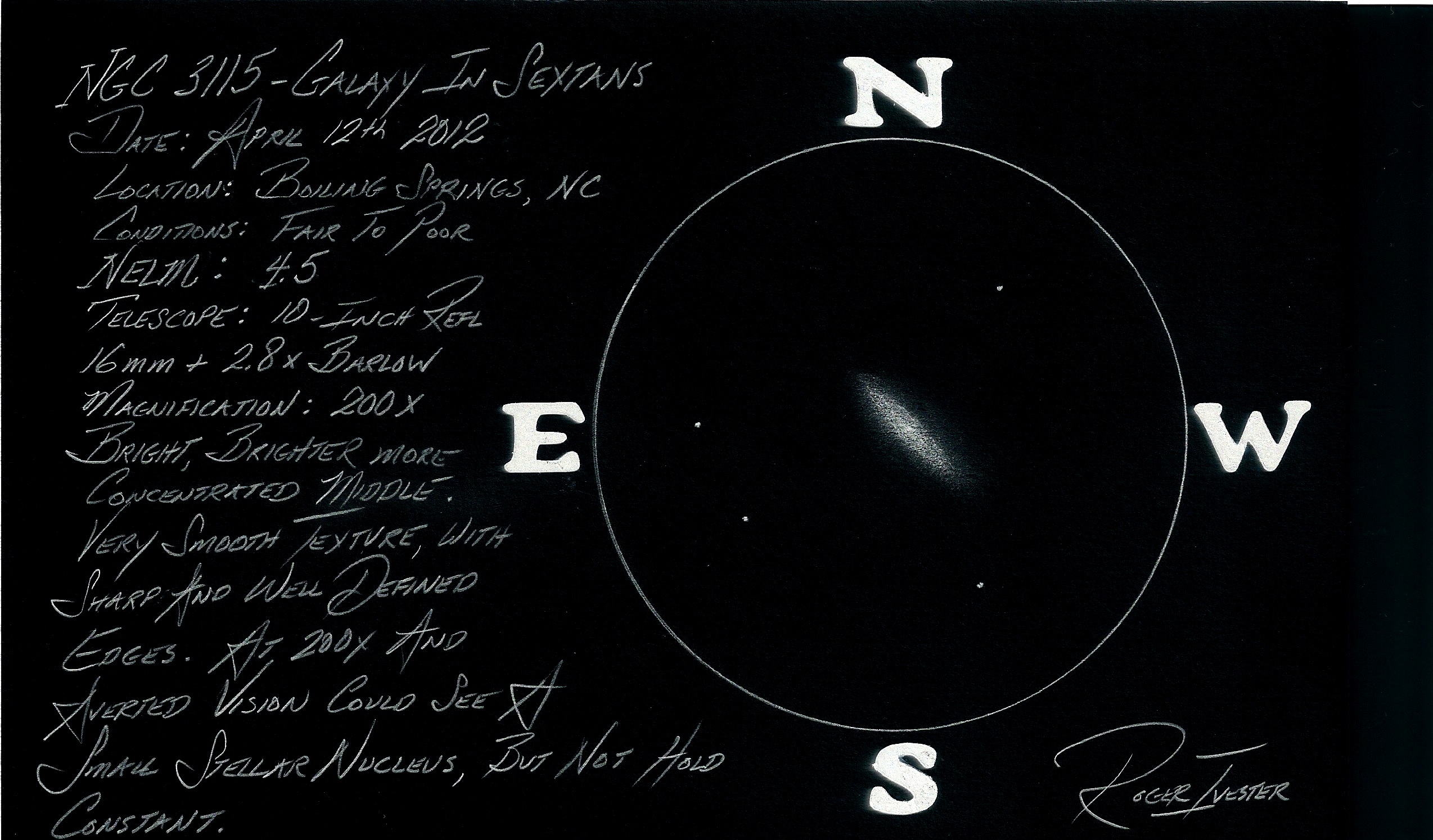 On April 12th 2012, I observed the bright galaxy NGC 3115 in Sextans. Conditions were a bit lacking with the NELM of only 4.5, from my light polluted backyard. I was using my 10-inch f/4.5 reflector with a magnification of 200x. The surface brightness of this galaxy is pretty high, so high magnification works well.