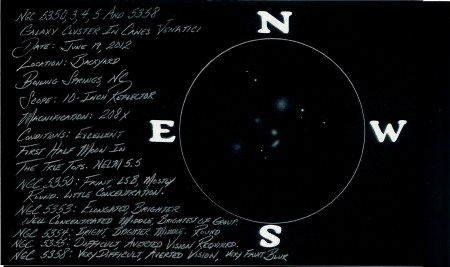 Conditions: Excellent with a temperature of 65 degrees and a very low humidity of 44% which is very unusual for the foothills of NC in June. The NELM was near 5.5 and the first half moon was setting in the tree tops, which took a bit away from the fainter galaxies of this group.