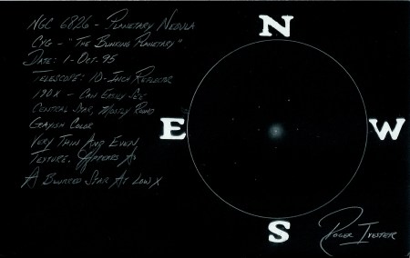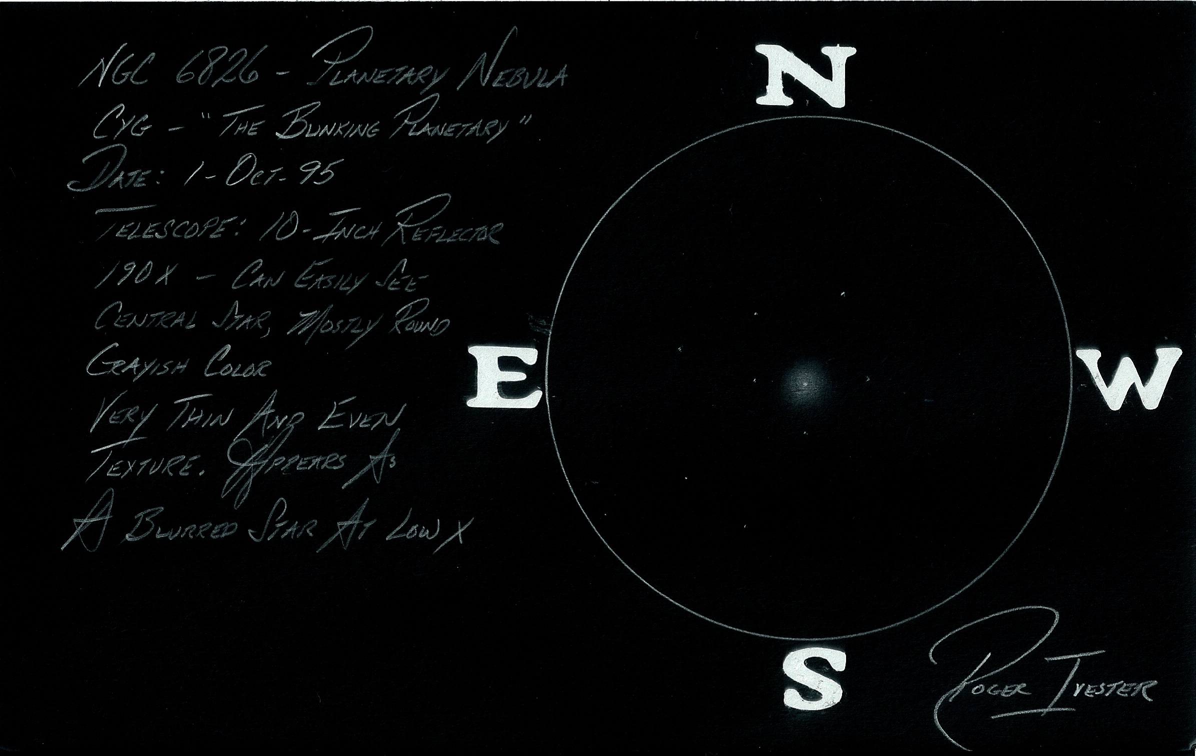 NGC 6826, also known as the “Blinking Planetary” so called because when observed with direct vision the outer nebula appears to vanish, leaving only the central star. When using averted vision, the nebula reappears. This phenomenon can be seen in scopes as small as a 60 mm refractor. When observed with a 10-inch reflector at 190x this planetary appears mostly round, grayish in color, and fairly bright. The outer nebula is fairly thin with a translucent appearance, and uneven edges. The 11th magnitude central star appears very bright, with either a 4-inch refractor or 10-inch reflector. The following sketch was made using a No. 2 pencil, and the color was inverted using a scanner.