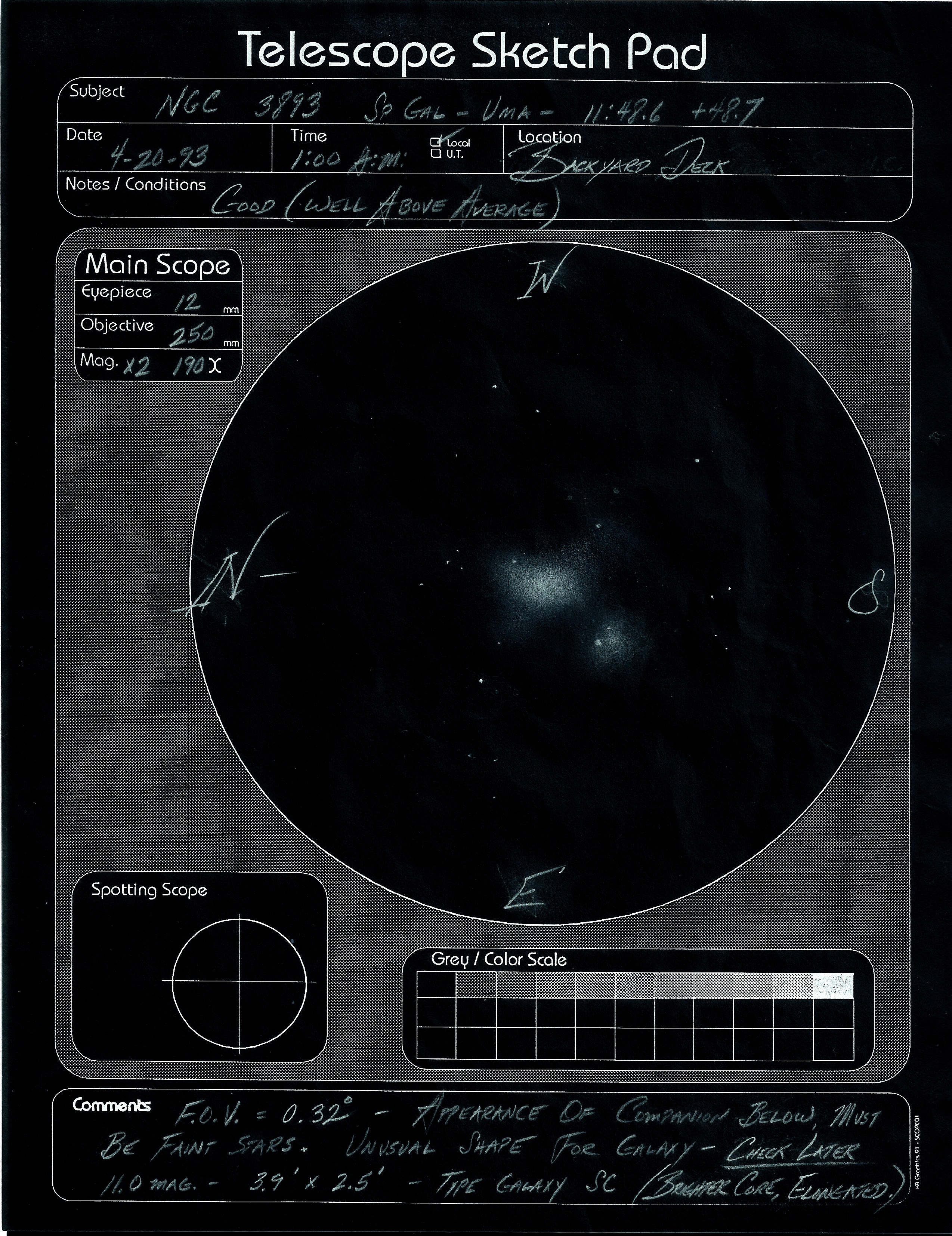 While reviewing my logbook, I discovered that I’d not followed up on an object viewed on 20 April 1993. The primary object was NGC 3893, an 11th magnitude galaxy in Ursa Major. While making my sketch of this galaxy, I had noticed a smaller much fainter object SE of NGC 3893.