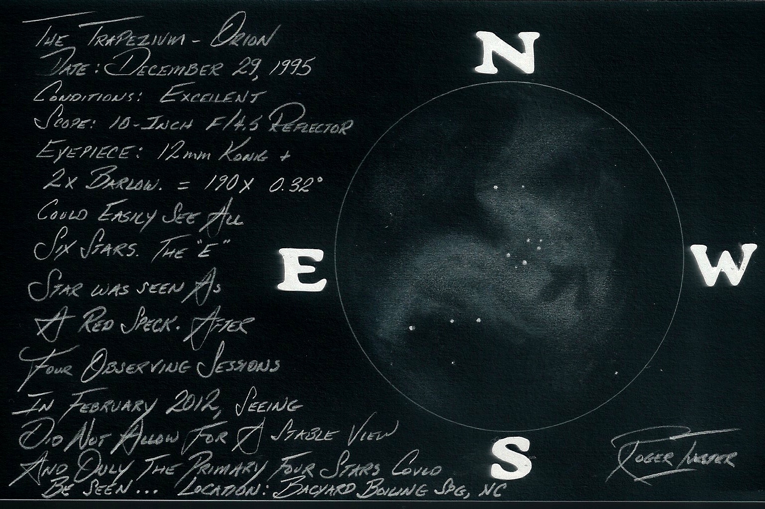 12-26-99: 10-inch f/4.5 reflector @ 142x – Fair to good. All six stars visible, E and F fairly easy.
