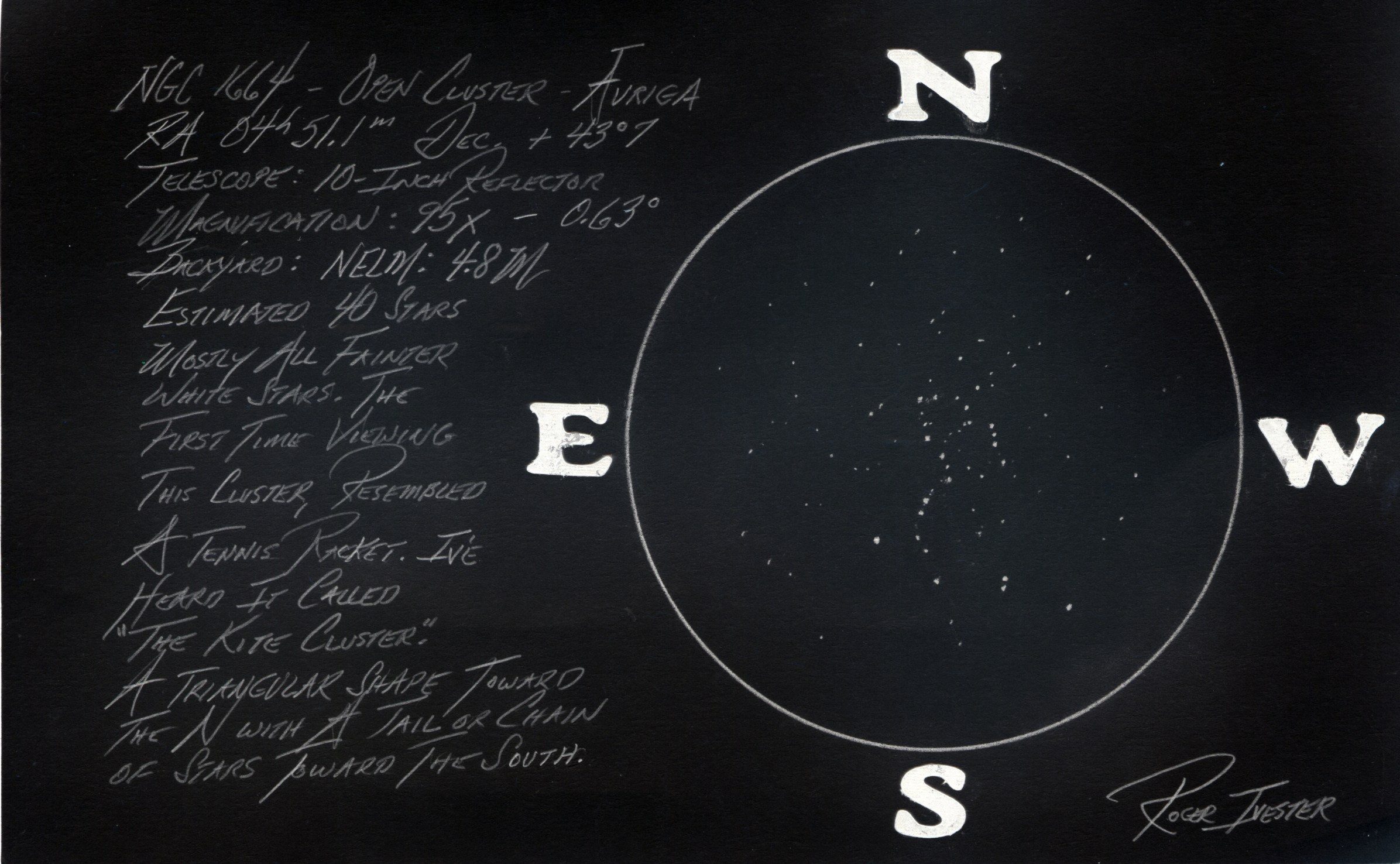 Telescope: 10-inch reflector at 57x, from my moderately light polluted backyard in the foothills of western North Carolina. The following pencil sketch was made using a No. 2 pencil on a blank 5 x 8 note card, with the colors inverted using a scanner.