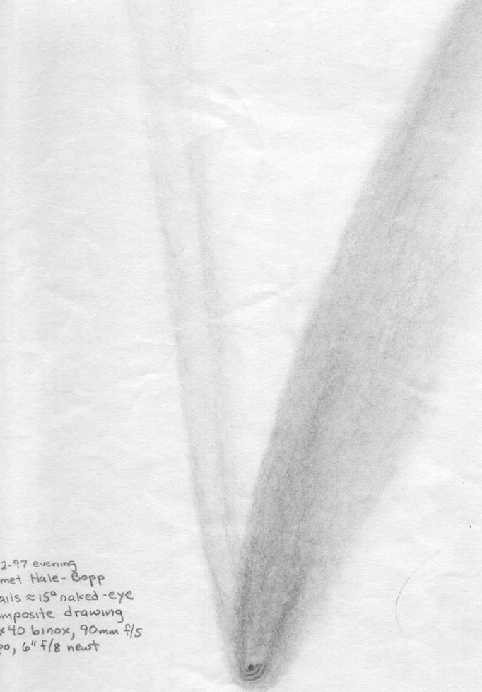 Unfortunately, the sketch is actually larger than our scanner can copy, so some of the comet is cut off. The sketch was made on 4/2/1997. The tail was about 15° long to the naked eye. To get the tail and the core detail in the same sketch, I used three different instruments: 8×40 binoculars, a 90mm refractor, and a 6-inch reflector.