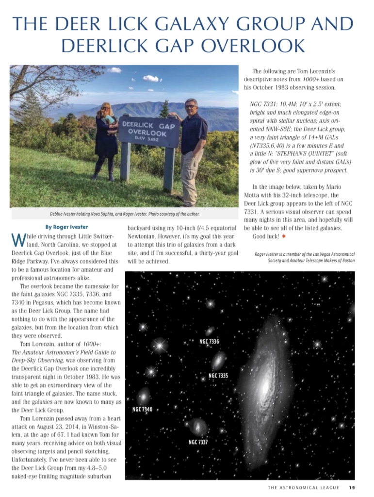My objective is to complete a personal goal of seeing and sketching galaxies (NGC 7335, 7336 and 7340) known as “The Deer Lick Galaxy Group.” This “these three galaxies” were given this name by Tom Lorenzin, based on an incredible night of transparency and seeing from the Deerlick Gap Overlook on the Blue Ridge Parkway in the early 1980’s.