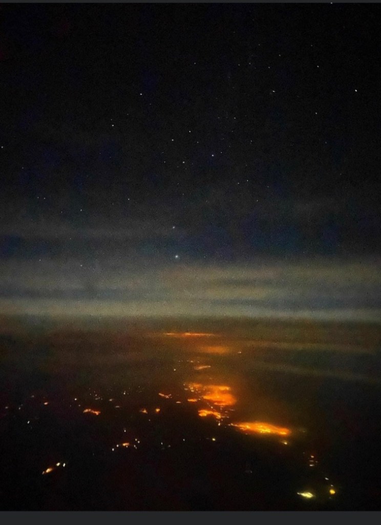 The residual cockpit lights, moonlight behind us, and the haze of high altitude cirrus kept us from seeing the Magellanic Clouds.