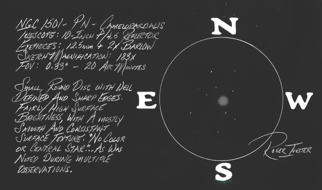 Lawrence Parsons (the 4th Earl of Ross) and his assistant Ralph Copeland observed NGC 1501 several times with the 72-inch Leviathan… Perhaps the best description comes from Lord Rosse’s observation on 15 January 1868: A bright ring and inside it a dark annulus, very decided. A star in the centre seen very clearly and continuously with various powers; suspect variable [unequal?] brightness in the ring, perhaps a dark spot in it nearly on the preceding [western] side. The following [eastern] side of the ring appears broadest and to approach the central star nearer than the preceding side does. The north and south sides of the ring seem rather brighter than the preceding and following sides. Suspect other bright points in it, but am not at all certain. It is slightly elliptical, its major axis being preceding and following.