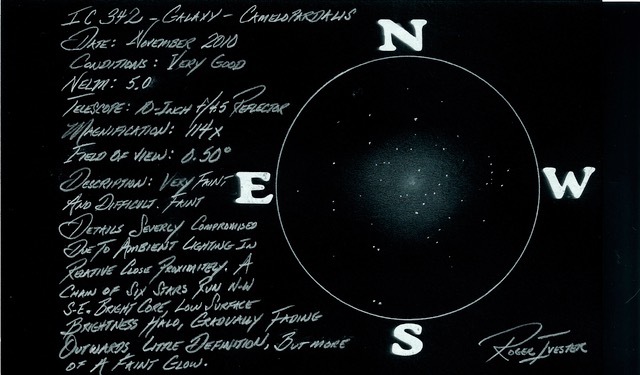 This galaxy is best observed with low to medium magnification. I used 114x for the following pencil sketch. The 10-inch presented IC 342 as little more than a large faint glow without structure. A faint and small core could be seen with averted vision, with the absence of visible detail being attributed to the lack of a dark site, which reduced the contrast significantly.