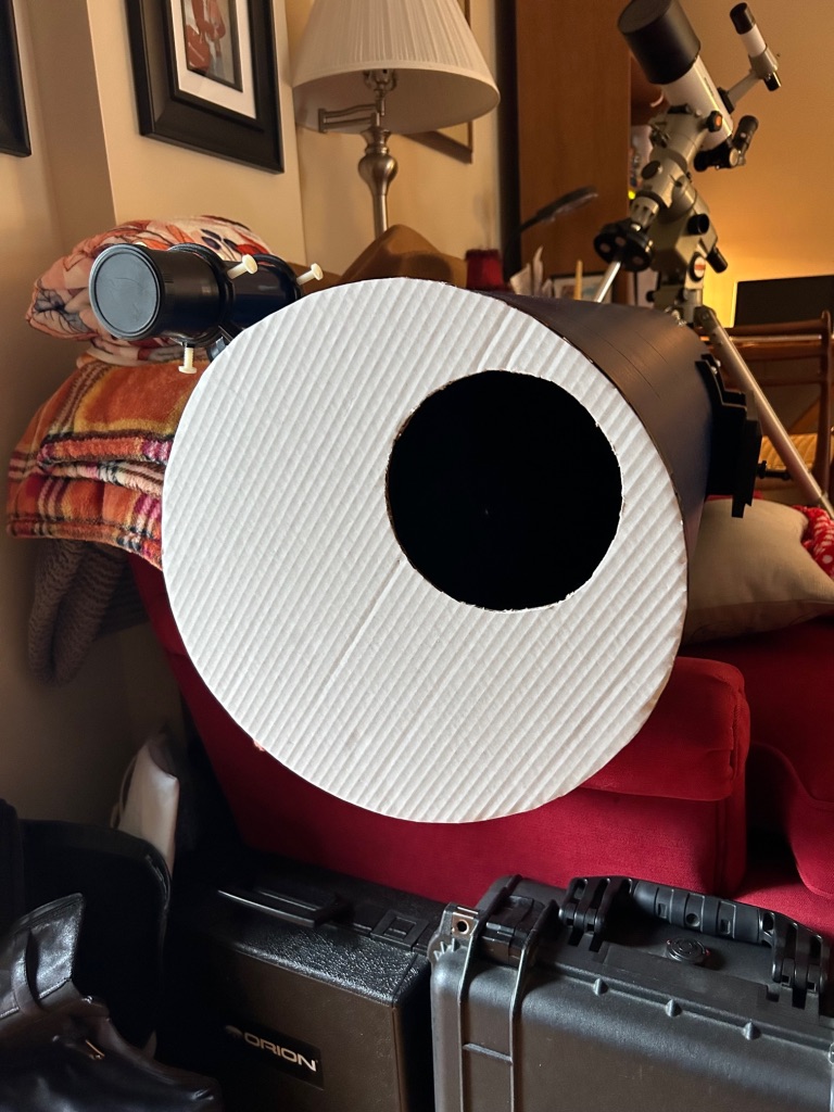 There is science and calculations as to how large the reduction mask should be, and that it should not extend over the light path of the secondary of a Newtonian. However, in past applications, from my experience, going beyond the path of the secondary has never presented a problem. Now there are limits, as common sense would dictate. So, I’d suggest no more than one-inch over the path of the secondary might be a good rule of thumb…if using a 10-inch Newtonian. After all, it’s just a small “crescent” cut-out over the path.