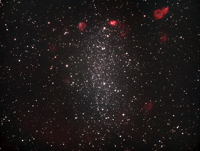 Barnard’s Galaxy is a member of the Local Group, a small cluster of about 40 galaxies including our own. It was discovered by Edward Emerson Barnard in 1884, but not recognized as an extragalactic object until the 1920s.