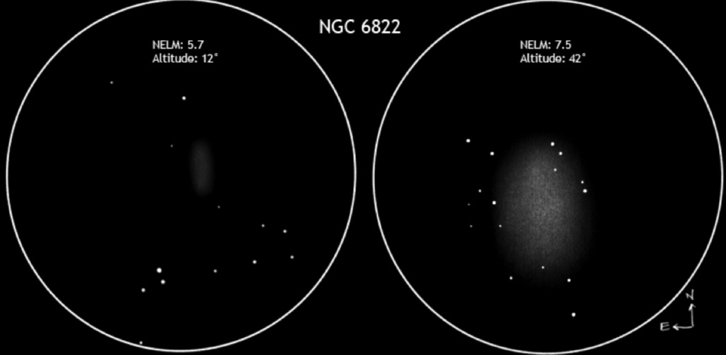 I have attempted to observe galaxy, NGC 6822 from my backyard since the early 90’s. My problem has been due in-part to a pesky unshielded street light in relative close proximity to my house. On the night of about September 14, 2014, using a utility building for a light block, I was surprised and elated to finally see this galaxy. I used a 102mm (4-inch) refractor with a magnification of 63x, and used a dark cloth to cover my head to reduce ambient lighting.