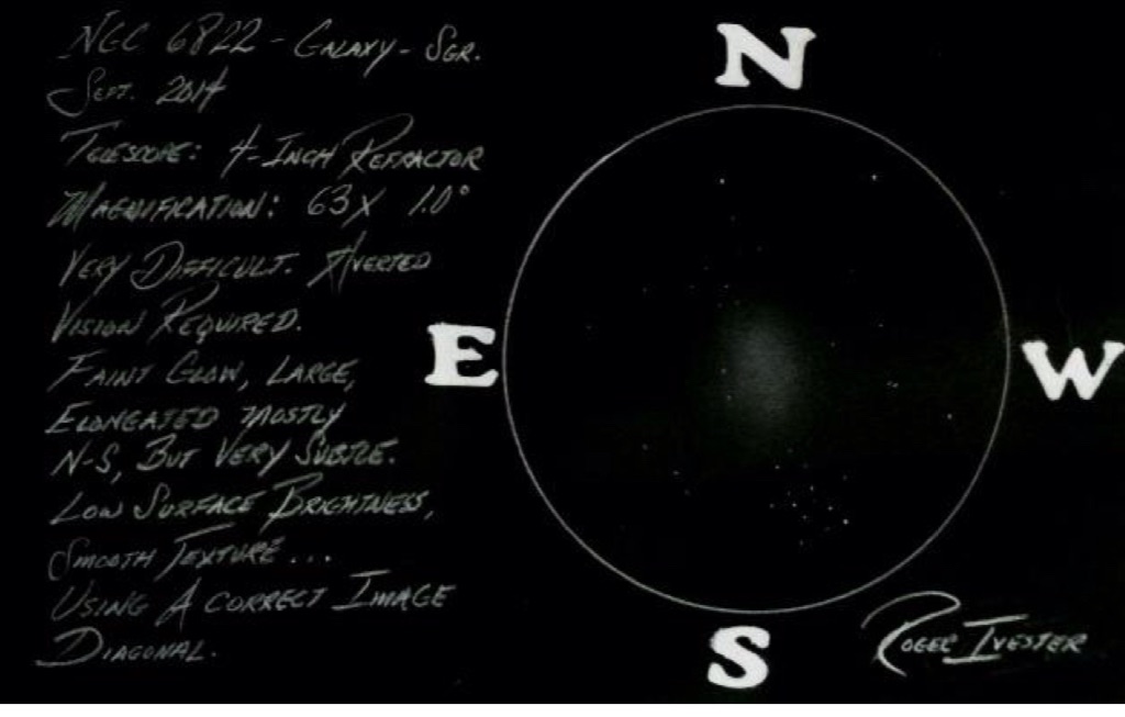 I was finally able to make that long awaited sketch and some notes. I noticed a subtle N-S elongation. The size was fairly large with very low surface brightness. The night was Saturday, September 20th 2014: