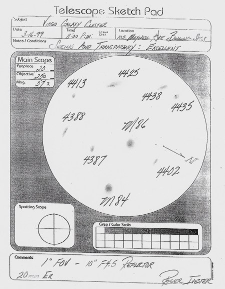Tom asked me if I’d ever viewed all nine galaxies within a 1° field of view, when centered on M86. I had not, but was most anxious to give it a try. However, It would be years later, on the night of March 16th 1999, before I was able to observe the galaxy group.