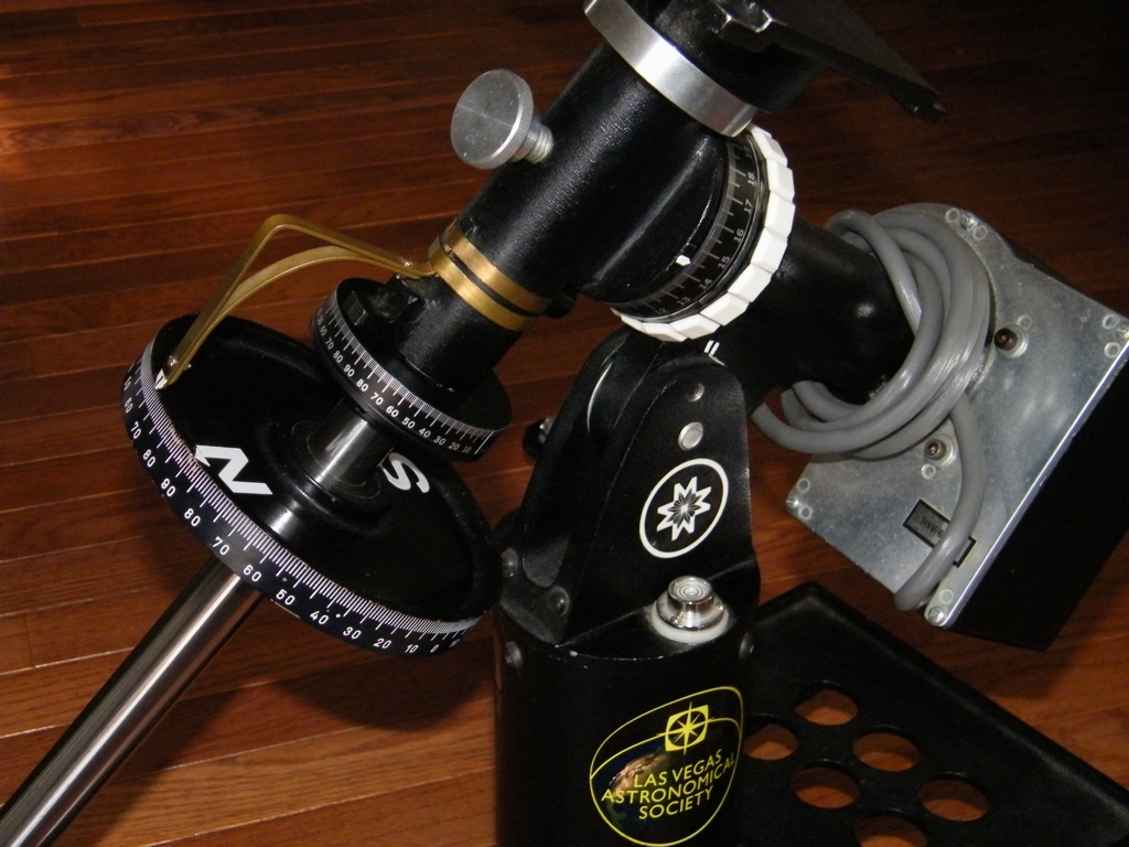 I fabricated the brass declination index-pointer (without making any permanent modifications) to use with the 6-inch Parks circle. With a reasonable polar alignment, the setting circles are very accurate, and perfect for locating deep-sky objects from a light-polluted suburban backyard.