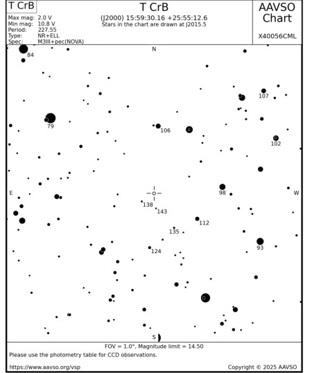 The following image (May 11th 2025) by Mario Motta of Massachusetts, using a 6-inch f/7.6 refractor. North is up and west to the right, with an approximate 1º field, which matches the AAVSO chart. T CrB is the ~10th magnitude star located in the center and presented very nicely while it’s still asleep. If you are following T CrB, and awaiting the outburst: Roger Ivester (May 14th 2025)