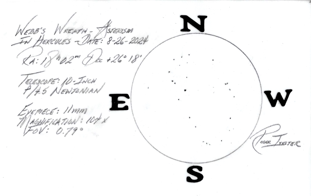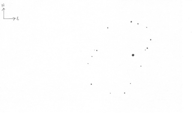 The following pencil sketch was made using a 10-inch f/4.5 EQ Newtonian with an 11mm eyepiece, apparent field of 82º. Magnification: 104x and field-of-view of 0.79º which was a perfect framing for the asterism.