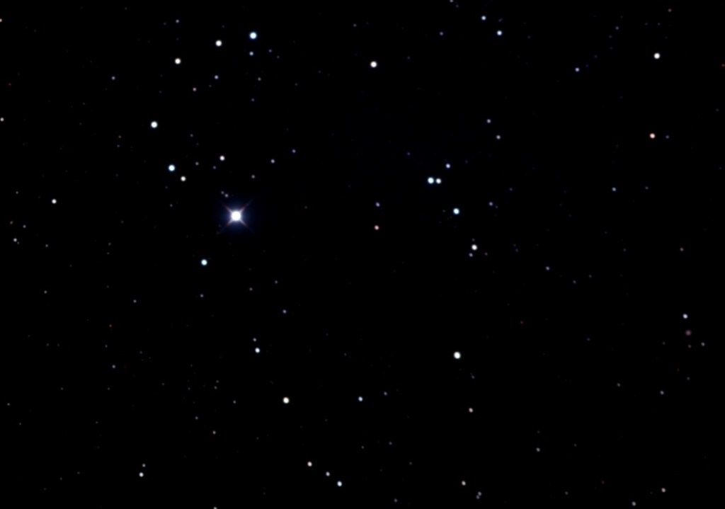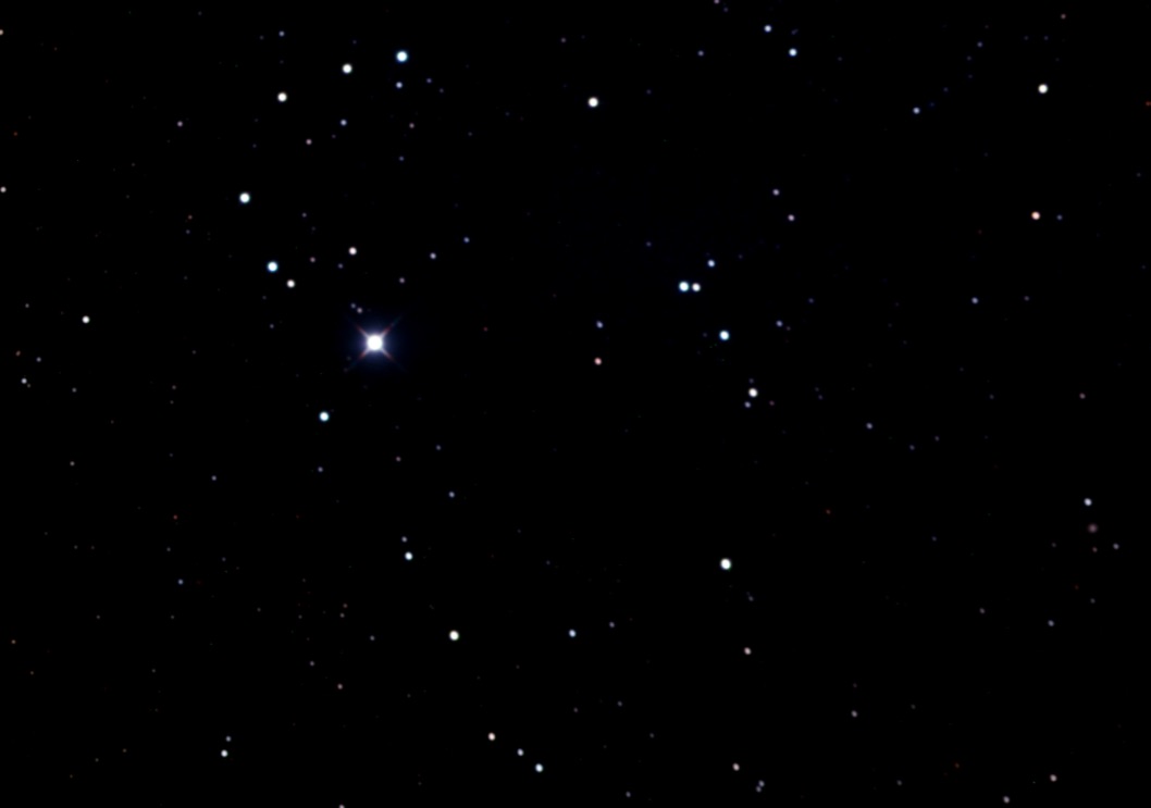 My 105mm scope at 68x reveals 13 additional stars, magnitudes 11 and 12, outlining 11′ x 7′ oval leans northeast and is dented inwards at the bright star.”