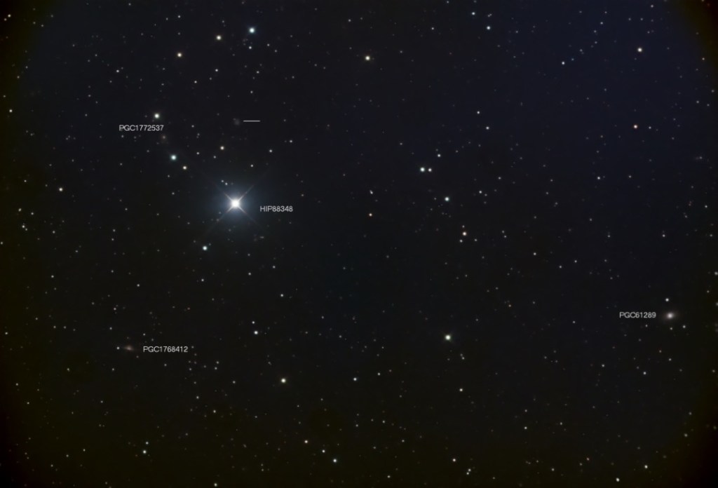 PGC or LEDA 1772537 was easy to pinpoint, as it lies at the midpoint of a mag 10.8 star 40″ SW and a similar star 40″ NE (two of the main stars in the Wreath). At 610x it was very faint and quite small, perhaps 5″ diameter, but definitely non-stellar. I may have just been seeing the core region of this galaxy. Checking later, I noticed that HyperLeda lists a B magnitude of 17.93 ± 0.50 and NED list a single redshift at z = 0.192.